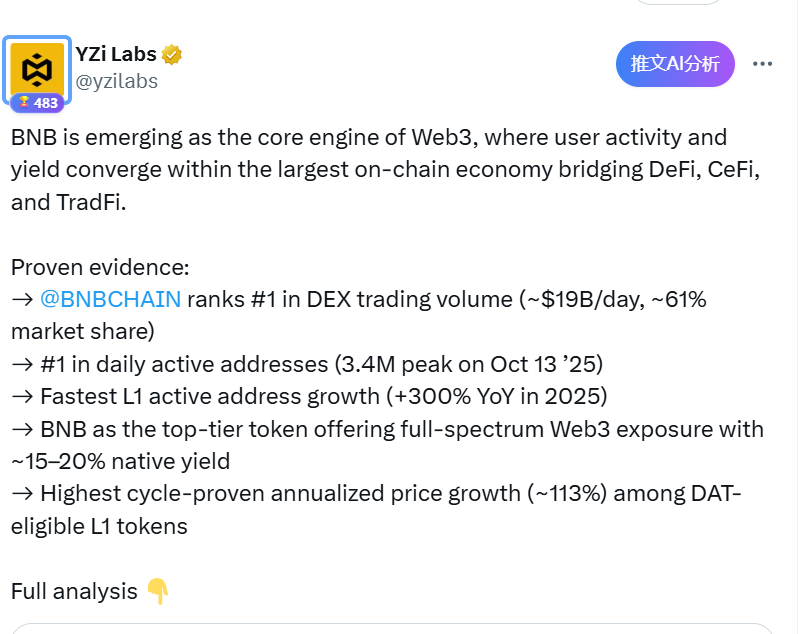 YZi Labs @yzilabs released the "BNB Report", which contains a large amount of information. For example, Changpeng Zhao’s personal holdings of BNB are less than 1% of the circulating supply. In addition, #Aster was also mentioned. Aster's on-chain sustainability heralds Hyperliquid's leadership, pushing BNB Chain to break through BNB and positioning itself as the trading engine of the global Web3 economy. #BNBChain will be significantly updated in 2026 and beyond to achieve a CEX-like experience. Currently, BNB’s holding structure is widely dispersed, with approximately 66-67% of BNB held by non-affiliated public holders (on exchanges or self-custody), approximately 27% used by the BNB Foundation for programmatic supervision, and Binance Treasury accounting for approximately 4-5%. BNB mainly reduces the circulating supply through two complementary mechanisms: Auto-Burn and BEP-95. ![]() ![]() BNB in-depth analysis report (full text translation)authorHaley H (Investment Director of YZi Labs), Ella Z (Head of YZi Labs) executive summaryBNB ("Build N Build") is the native token supporting BNB Chain, which is becoming the core infrastructure of the future global Web3 world. Compared with similar assets such as Ethereum (ETH, decentralized financial infrastructure) and Bitcoin (BTC, value storage tool), BNB is positioned as an efficient trading engine for the global Web3 economy. As a top-tier coin, BNB is designed with a deflationary structure. Its circulation supply is fully released, and the ownership on the chain is dispersed (about 67% is held by the public) ; About 27% has been destroyed ; Zhao Changpeng’s personal holdings account for less than 1% (see text for data source), which greatly reduces unlocking risks and centralization risks, thereby enhancing institutional trust. According to data from Dune and Nansen, the BNB Chain ecosystem ranks first in the world in terms of decentralized exchange (DEX) transaction volume, number of active users, and number of stablecoin wallet addresses, covering multiple fields such as decentralized finance (DeFi), artificial intelligence (AI), memes, real world assets (RWA), and consumer applications. Holding BNB can provide one-click access to a wide range of on-chain ecosystems across the entire industry. The key is that BNB is considered the only token that allows users to have full access to the entire process of Web3 asset issuance and circulation (the historical native holding return rate is about 15%-20%). It covers all levels and areas of Web3's core assets: from blue-chip tokens listed on exchanges, to mid-cap narrative tokens, to emerging long-tail tokens on BNB Chain. BNB enables users to directly participate in the growth and value creation of the entire crypto asset ecosystem, seamlessly connecting centralized finance (CeFi) and decentralized finance (DeFi). Among the Layer-1 tokens qualified to issue digital asset trusts (DAT), BNB has demonstrated strong performance through multiple rounds of market cycles, with an annualized increase of up to approximately 113%, outperforming ETH, BTC and SOL (see text for data source). For institutional investment portfolios, BNB has the potential for structural decoupling and asymmetric upside, which can enhance the diversification of multi-asset strategies and increase risk-adjusted returns. BNB has previously had limited exposure in the US market, but this situation is gradually changing: mainstream exchanges including Robinhood and Coinbase have launched the BNB DAT/ETF issuance process and BNB listing plans. Diversified BNB-denominated financial products such as BNB DAT, ETFs, and dividend funds will further release the liquidity of traditional finance (TradFi) and expand its financial functions. In addition, Changpeng Zhao's recent pardon has sent a strong positive signal to the market, providing a special window of opportunity for BNB to expand acceptance and adoption in North America and around the world. Table of contents