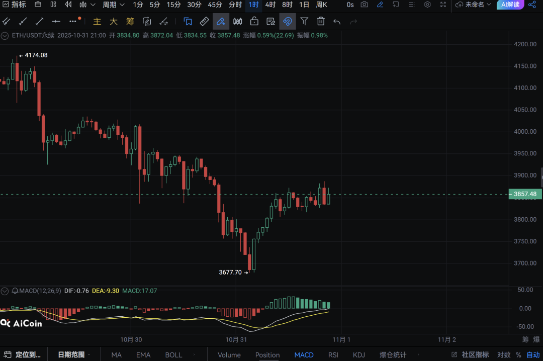 2. Long-short trend: short-term bull counterattack, long-term still needs to be observedFrom a technical perspective, there are clear signs of bullish dominance in the short term: the price has successfully stood on the middle track of the Bollinger Bands (3814.45), the red column of the MACD indicator continues to enlarge, DIF and DEA are about to form a golden cross, and the bullish momentum is being released; The short-term moving averages EMA7 and MA7 turned upward, forming a short-term long arrangement. However, the mid- to long-term bear trend has not been completely reversed. After all, the big structure of the price falling all the way from the previous high of 4253 is still there. If it cannot effectively break through the Bollinger Band upper limit of 3908, the rebound may just be a correction in the bear trend. 3. Technology + News + On-chain: Three-dimensional analysis of pros and cons